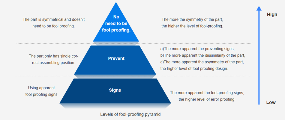 If there are possibilities of incorrect assembly on product design, the wrong assembly is likely occurred, causing the decreased efficiency, and raised cost and time. In a similar way, if there are possibilities of misuse of medical products, then the end users may use the product in an incorrect way, leading to various consequences and even threatening life and health. Therefore, fool-proofing design is vital, which directly reduces mistakes and eliminates rework during assembly, optimizes user experience, and avoids the unnecessary cost. As Levels of Fool-Proofing Pyramid figure shows, the pyramid rises, so does the level of fool proof.