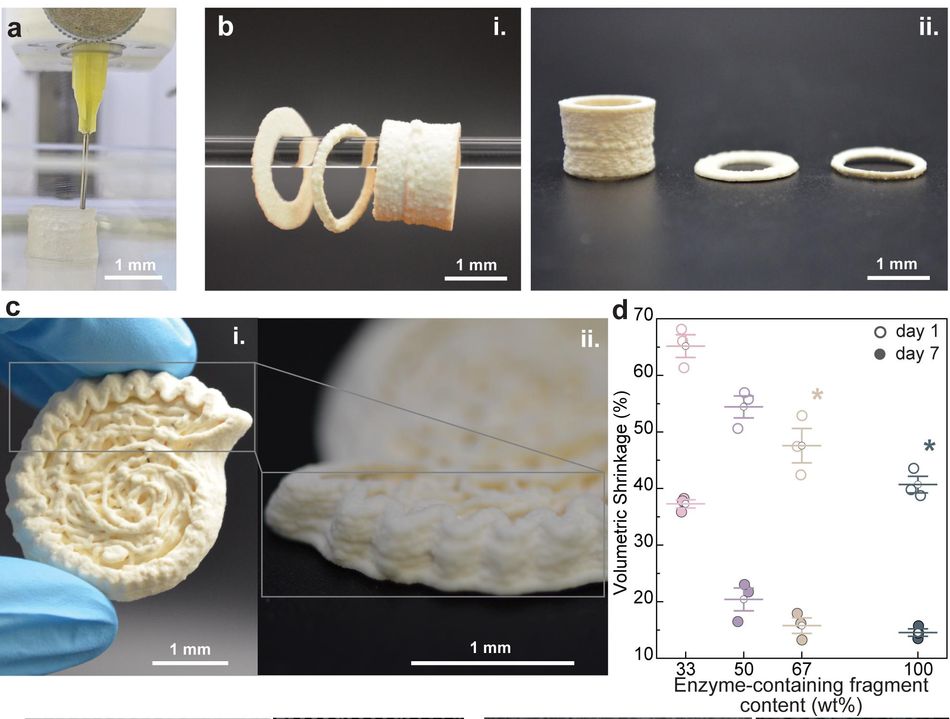 Researchers in the Soft Materials Laboratory (SMaL) in EPFL’s School of Engineering, in collaboration with ETH Zurich, Empa and the University of Fribourg, have now developed a way to 3D-print HA-based scaffolds using a room-temperature process that harnesses enzymes for fast mineralization. The resulting bone-like porous scaffolds can become load bearing within just 7 days. The research has been published in Advanced Functional Materials.