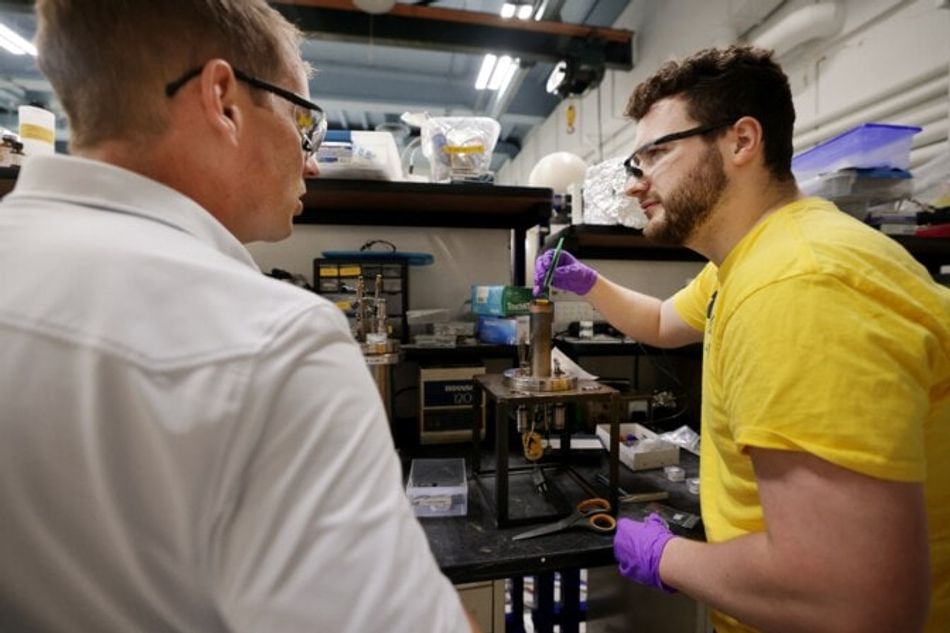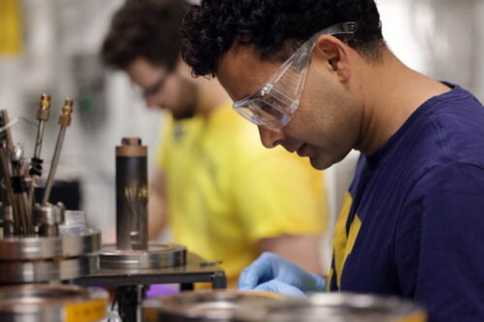 Kevin Field, professor of nuclear engineering and radiological sciences, and Ethan Polselli, a doctoral student in the same department, work together in the Michigan Ion Beam Laboratory where the dual ion beam tests were conducted. Credit: Brenda Ahearn, Michigan Engineering.