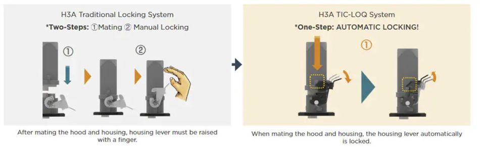 The housing itself incorporates the innovative TIC-LOQ (Twist, Insert, Connect - Lock On Quickly) automatic locking system. Unlike traditional heavy-duty connectors that require more complex two-step mating procedures, involving careful alignment and separate locking actions, the HDC H3A-TIC-LOQ system allows technicians to complete the connection in just two seconds through a single, intuitive motion. This reduction in mating time and complexity has been shown to directly reduce maintenance and downtime, resulting in improved production activity for robotic installations.
