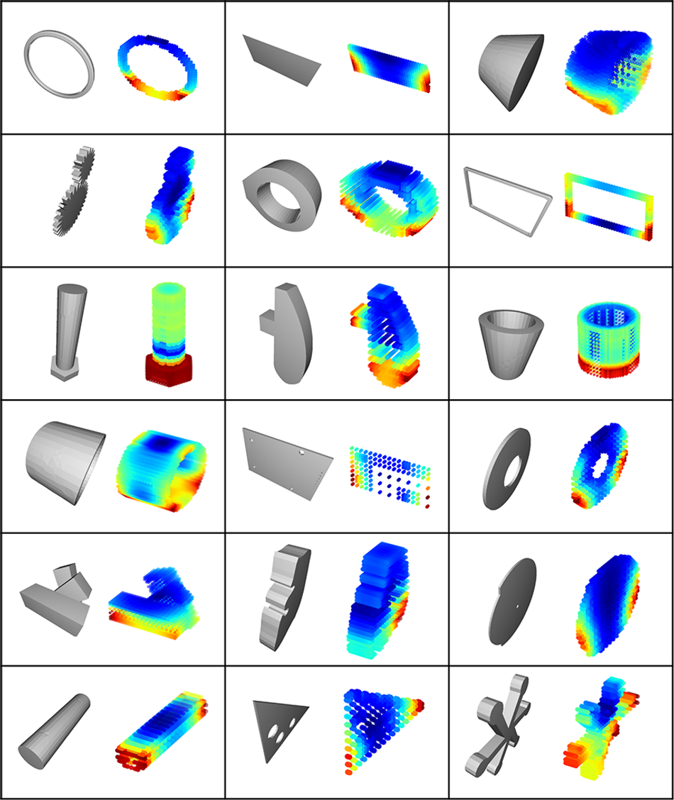 The datasetOpens in new window covers a wide range of shapes, with subtle to drastic variation. This scale and variety allows the model to achieve more than 85 percent accuracy when predicting simulation results. After the initial training process, TAG U-NET can make predictions for a part in less than one second. If used iteratively, TAG U-NET could save significant amounts of time and resources compared to running full simulations throughout the design process.