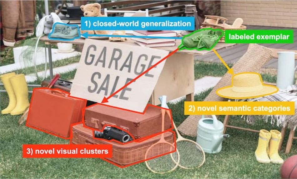 Further, OAK is able to discover news categories it has never seen during training. For example, when asked to recognize items in an image that can be sold at a garage sale, the system would learn to find items like luggage or hats even if it was only shown examples of shoes.