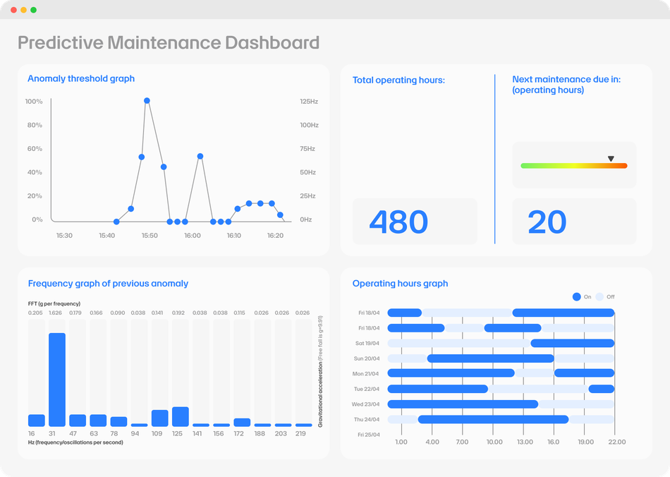 By accurately identifying vibration patterns, the BoB Assistant can also track the operating hours of the machine, sensing when it is in use and when it is idle. This valuable data allows for proactive maintenance planning, as one can monitor the amount of operating hours in the akenza platform and indicate when the machine is due for a service. This helps to prevent unplanned downtime and costly breakdowns, ensuring that the machine is serviced at the optimal time. It also helps to make the service interval dynamic based on the actual operating hours of the machine.