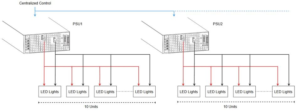 If one power supply fails, it only affects the 10 lights it powers. The rest of the room remains operational.