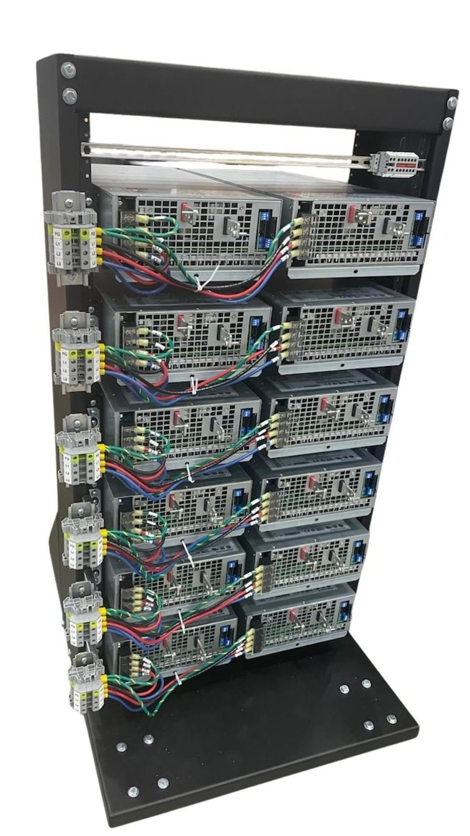 Built racks with status indicators and manual control interfaces for all 12 PSUs in each rack