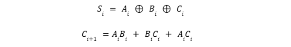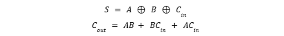 A full adder extends the functionality of a half adder by including a carry input Cin. So, it adds three bits (A, B, and Cin) to produce a sum and a carry output (Cout). The full adder equations are: