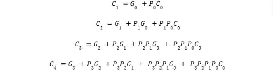In a 4-bit CLA, carries C1–C4 are calculated using P and G terms and the initial carry C0. For example, the first few carry bits are: