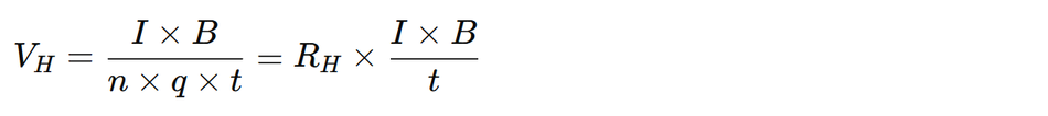 The magnitude of the Hall voltage V(H) for a conductor of thickness (t), carrying current (I) in a uniform magnetic flux density (B) is given by: