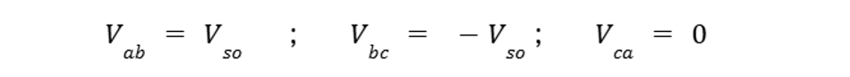 In the 180° conduction mode, each switch conducts for half of the fundamental cycle. At any given time three switches are on (one in each leg) and three are off. The switching intervals are shifted by 60° so that the phase voltages are balanced. For example, consider the first 60° interval (0°–60°): switches S1, S4 and S5 are on while the others are off. The resulting phase voltages are: