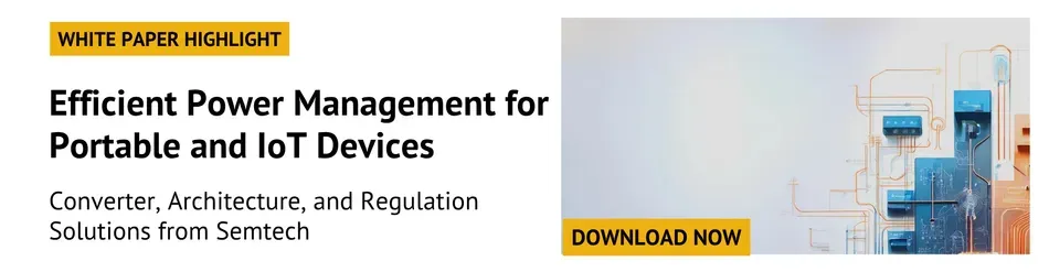 To explore the full system-level approach, including high-efficiency portable converters and ultra-low-Iq regulation for sensitive domains, download the complete Semtech whitepaper, Efficient Power Management for Portable and IoT Devices. It provides deeper technical guidance across all three pillars of portable power design.