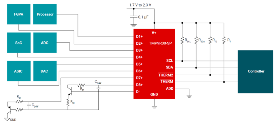 - For multi-point monitoring, the TMP9R00-SP , as shown in Figure 2-1, enables up to eight external sensor inputs. These can be connected to on-chip temperature diodes of FPGAs or ASICs, or to discrete sensors placed near thermal hotspots such as power FETs. An additional ninth sensor is integrated into the device for local measurements, enabling comprehensive thermal insight across the board.