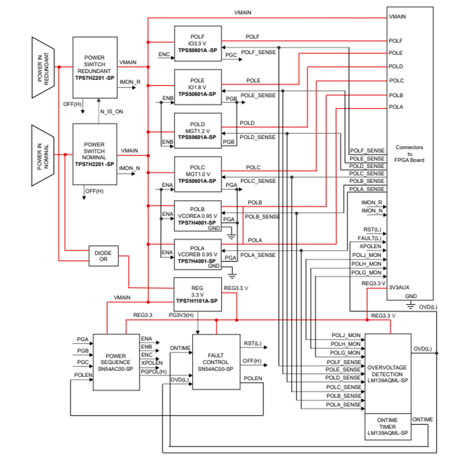 It demonstrates redundant power input management, proper power sequencing and comprehensive fault detection and isolation mechanisms with very low number of components added. The design utilizes the TPS7H2201-SP smart load switch that integrates over-voltage and under-voltage protection, over-current and current sensing, along with thermal protection and internally- or externally- controlled load switching.