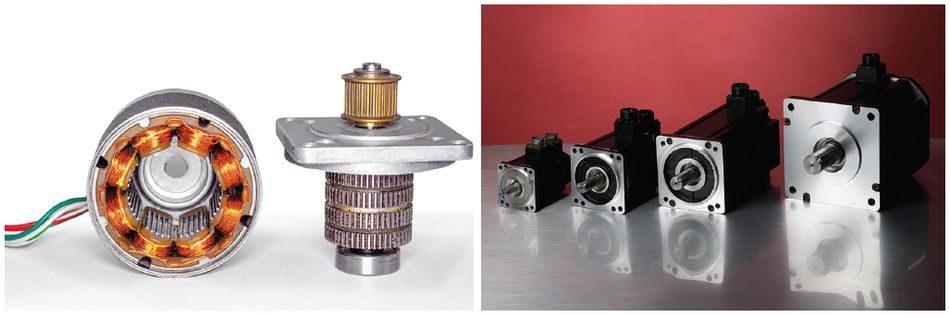 Two-phase stepper motors are typically controlled by two current sources that induce 90° phase-shifted sine- and cosine-shaped currents into the two phases of the stepper motor. The currents through the coils of the stepper motor (the stator) define the orientation of a magnetic field. The rotor aligns like a compass needle in the field of the stator coil. By electrically controlling the rotation of the magnetic field, the rotor rotates through alignment in the magnetic field. Figure 1 shows the stator/rotor arrangement of a standard hybrid stepper motor and some example stepper motor types.