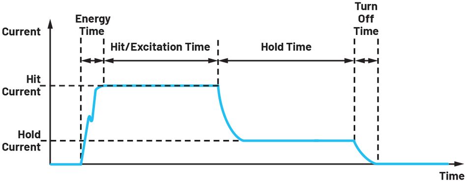 Figure 2 shows the typical current profile when driving a switching valve. The small dip during the current ramp-up phase (energization time) is due to the back electromotive force (BEMF) generated by the plunger movement. When the excitation time is over, the current can be reduced to a hold level to hold the plunger in place as long as needed. Proportional valves can hold the plunger in any position by controlling the energy flow and by adjusting the solenoid current. They are normally used in a closed-loop control system to control a specific system variable; for example, pressure, air, or fluid flow.