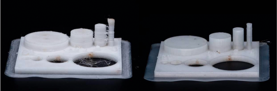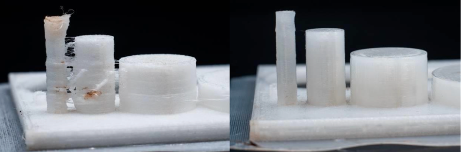 A recent study by Thought3D has shed light on how in-line drying can significantly improve the surface finish and dimensional accuracy of FDM prints. The study compared a calibration part printed with untreated wet nylon at 3% humidity and the same part printed with the same material but treated with in-line dryer (Drywise) – see Figure 1 below. The part printed using Drywise showed superior surface finish, while the untreated part had a poor surface finish and showed stringing and oozing on the pillars and in the holes.
