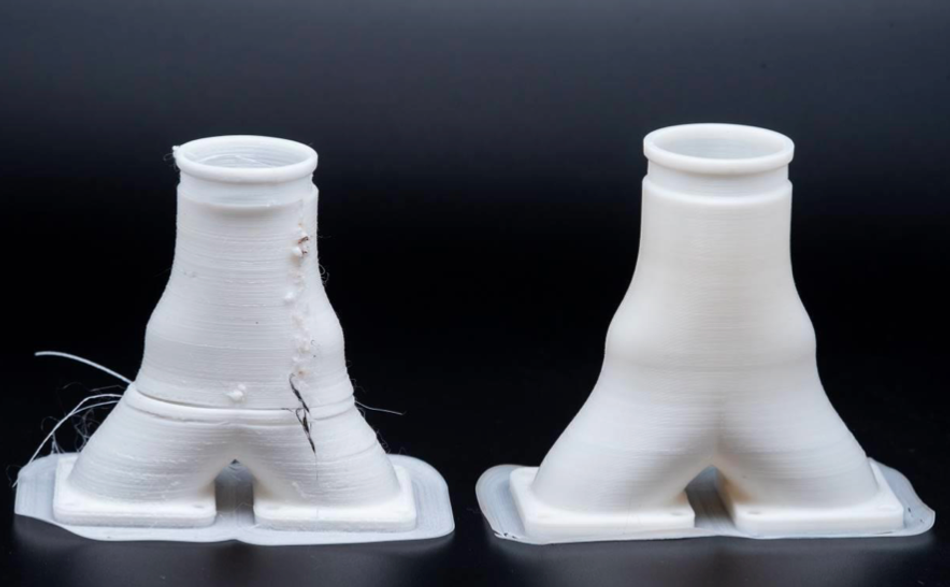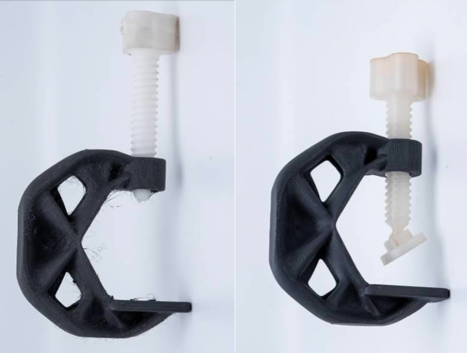 The clamp shown in Figure 5 was printed with Jabil PA0600 (black) and Addigy F1030 (natural) filaments. For the image on the right both filaments were dried using in-line drying. The image on the left was printed with the same filaments but not dried. Apart from the visual imperfections, the clamp which was not dried could not be easily screwed/unscrewed due to the variation in tolerances brought about by the presence of moisture in the material during printing.