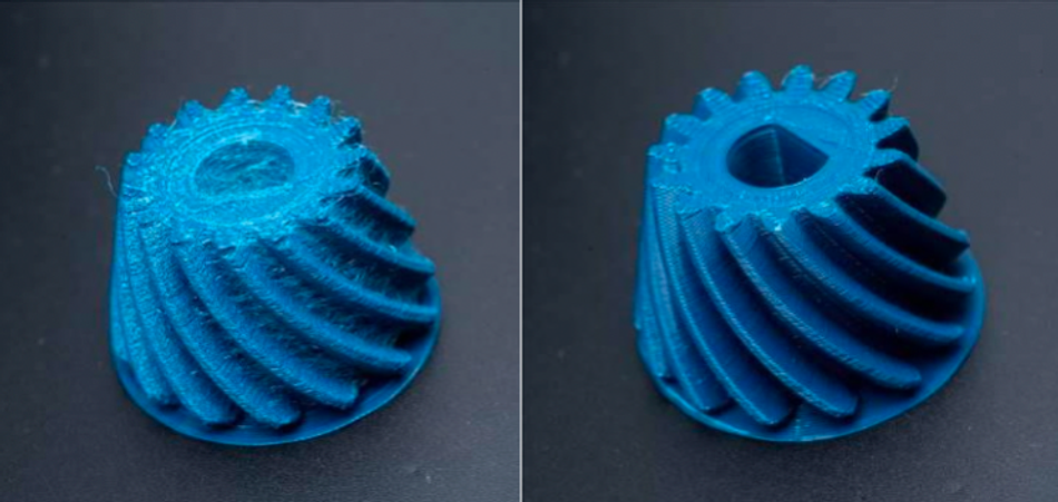 The gear in Figure 6 was printed using untreated wet material and on the right through in-line drying with Drywise. The part on the left shows severe stringing and oozing, and a very poor surface finish. Furthermore the stringing and oozing inside the hole will also lead to the part not fitting on a shaft due to the increased material deposits affecting the tolerance of the hole. The part printed with in-line dried wet filament shows perfect surface finish and does not present any tolerance issues.