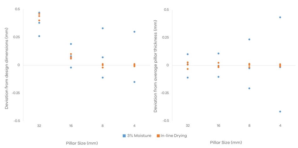 Figure 2 shows the deviation from the designed pillar thickness and the deviation from the average printed pillar thickness for wet and in-line dried calibration prints. The deviation from the average pillar thickness give a better indication of the scatter for simialr pillar sized. On average, both the wet and dry pillars tend to deviate less from the design value when the pillar size is smaller. This indicates that the deviation in both cases is not due to probably a result of the printing tolerances. However, both the absolute deviation and deviation from the mean show that there is more scatter in the dimensions of the wet part.