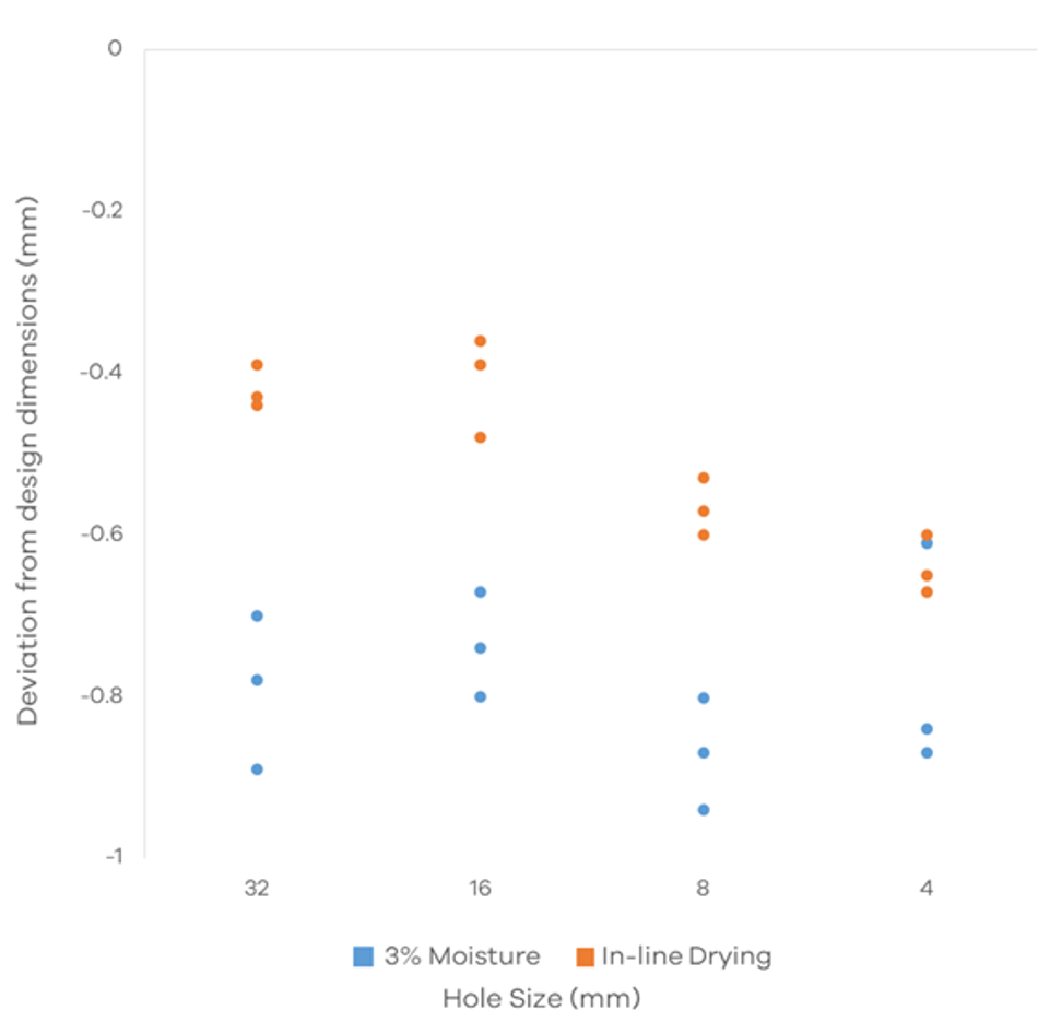 The study also found that holes in parts printed with wet filament were smaller than those in the parts printed with dry filament (see Figure 4). This is because when printing with wet filament, the extruded material tends to expand slightly due to the trapped water vapor inside the material. As a result, the resulting prints will have a greater chance of not being within the tolerance limits if they are printed with untreated wet filament. We observed that holes deviated by about twice the amount compared to what the holes printed with dried material.