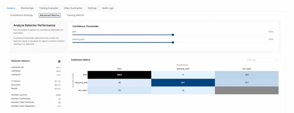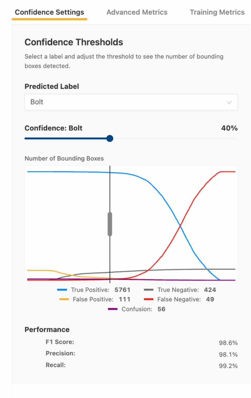 For example, say you have a detector that can detect “Bolts.” You can enter the analyze tab for that detector and use Matroid’s built-in confidence slider to quickly compare the detector’s precision, recall, and F1 score at any threshold. You can use this tool to quickly hone in on the best threshold for deploying that detector in a live environment.