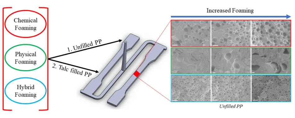 The diagram below illustrates the effects of these different techniques on polypropylene (PP). The accompanying micrographs show how foam formation increases, with clear variations in bubble size and distribution.