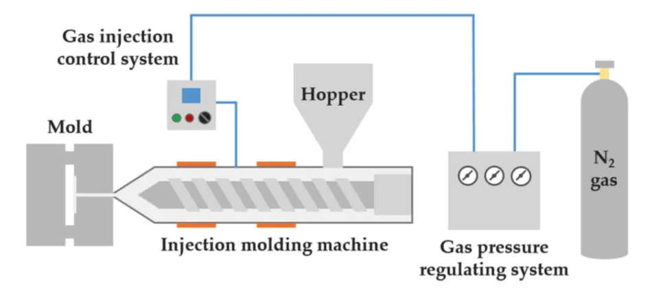 The physical foaming process involves forcing unreactive gas, such as nitrogen or carbon dioxide, into the polymer melt under high pressure. This forces the gas to fuse into the molten polymer. During the injection process, the pressure is reduced, and gas is forced to come out, forming bubbles within the molten polymer.