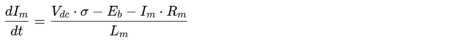 Here, Vdc is the supply voltage, Eb is the back electromotive force proportional to motor speed, Rm and Lm are the motor’s resistance and inductance, and σ represents the switching state (+1 forward, -1 reverse, 0 coast). The mechanical torque tau is proportional to current as: