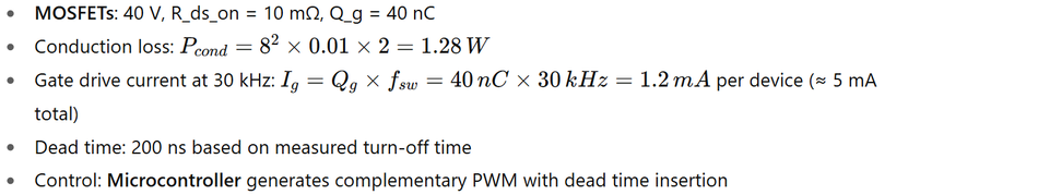 Select a Pulse Width Modulation (PWM) frequency that balances audible noise and switching losses. Frequencies between 20 kHz and 100 kHz are common; 25 kHz is above the upper threshold of human hearing. Dead time should exceed the maximum turn-off time of the MOSFET plus margin.