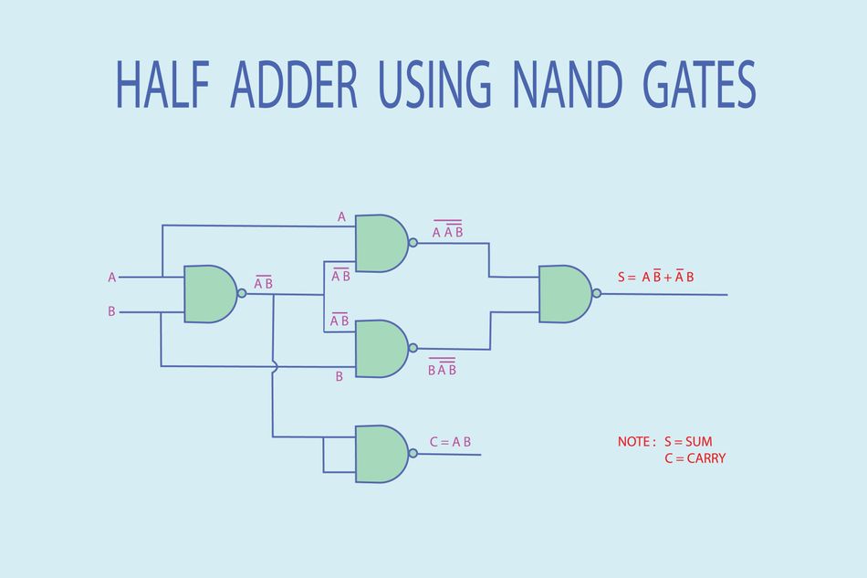 Because NAND is a universal gate, any logic circuit can be implemented using only NAND gates. Such a half adder requires at least five NAND gates.