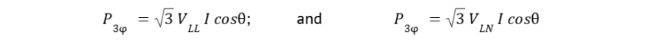 where I is the line current. The factor √3 arises from the 120° phase displacement between phases. For reactive and apparent power, the formula coefficients are the same but they include sin θ.