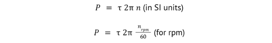 For rotating machinery, the analog of force is torque τ and the analog of velocity is angular velocity ω (radians per second). The power delivered by a torque is calculated by the following formula: