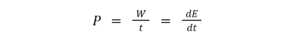 The rate of energy transfer or conversion is called Power. Mathematically, power P equals the work W done or energy E, expended per unit time: