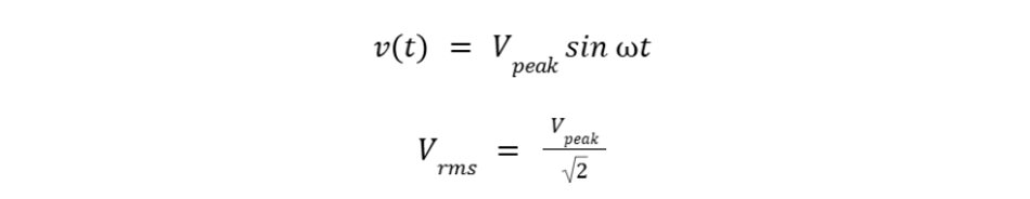- RMS voltage Vrms and RMS current Irms are used as equivalent DC values that produce the same heating effect. For a sinusoid: