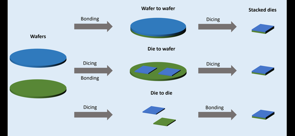 Wafer-to-Wafer, Die-to-Wafer, Die-to-Die assembly methods. Image Source: Research Gate