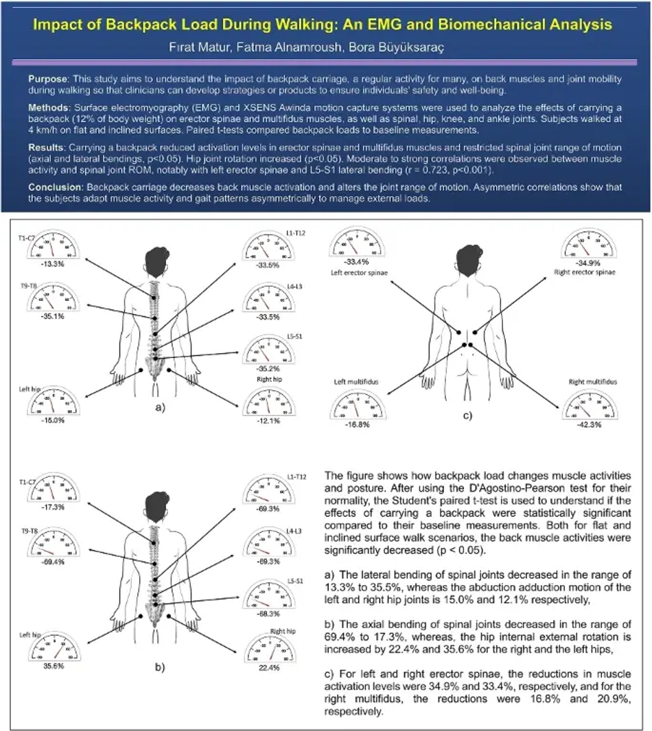 Carrying a heavy backpack clearly changes our posture, especially over long periods of time. But beyond the visible forward lean, what is really happening to our joints and movement patterns? Bora Büyüksaraç, Assistant Professor at Bahçeşehir University, wanted to look deeper than just posture. In his research "Impact of backpack load during walking: an EMG and biomechanical analysis", he set out to quantify the precise biomechanical trade-offs the human body makes when walking with a loaded backpack, analyzing the complex interplay between spinal kinematics, muscle activation, and joint range of motion in a cohort of young adult participants.