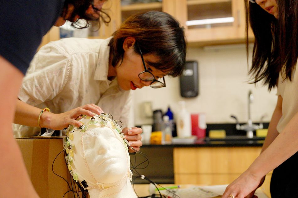 Getting good signal quality requires patience. We must apply conductive gel to each of 64 colored channels, adjusting and readjusting until the numbers turn green on our monitors, indicating each signal is coming through clearly.