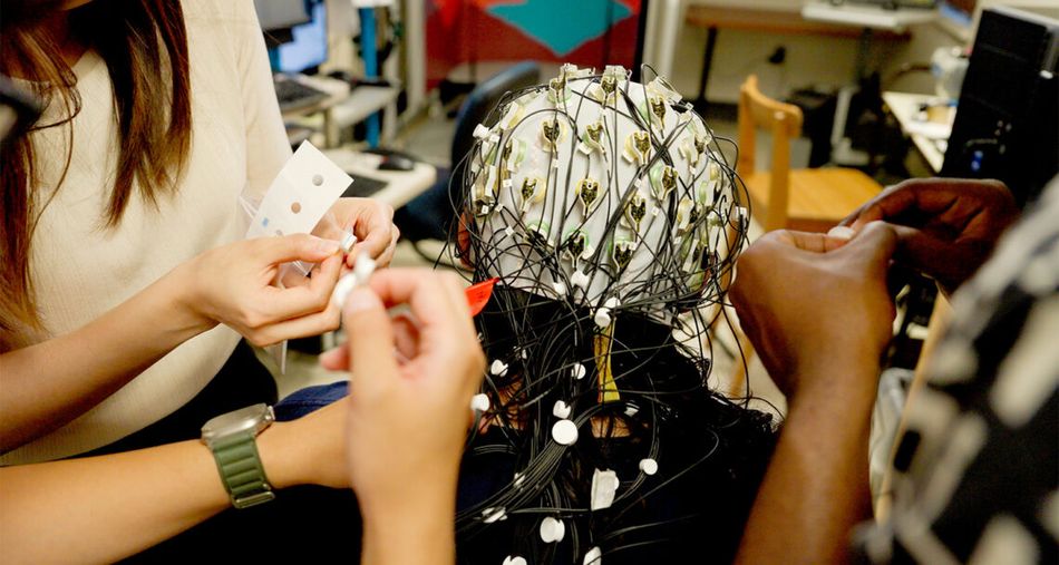A participant enters the room, and we prepare a cap for them that is studded with electrodes to monitor electrical activity in their brain. The electrodes are carefully positioned on the person’s scalp to capture the electrical symphony of the brain.