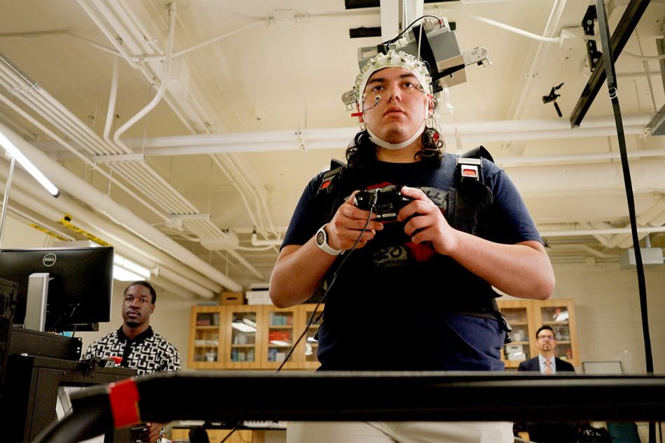 By the time we finish this process, each participant is adorned with multiple sensors and wires but is still able to move naturally through the experimental tasks thanks to the wearable technology.