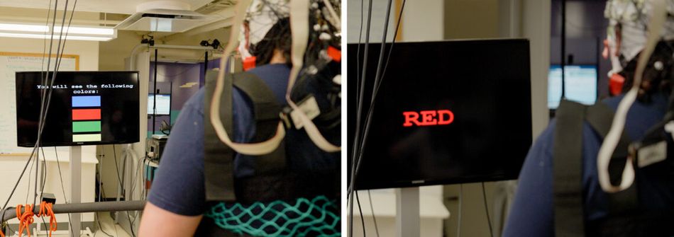 Another test, called a Stroop Test, adds cognitive interference to the mix of stressors. While seated or walking on a treadmill, participants must perform a thinking task that requires a quick response to visual stimuli. The task involves reading the names of colors that are printed in the same, or a different, color. This exercise seems trivial until you’re doing it under time pressure while also walking on a treadmill and wearing numerous sensors. The seated version is challenging enough; the walking version adds a layer of complexity that makes the task particularly rich for studying anxiety.