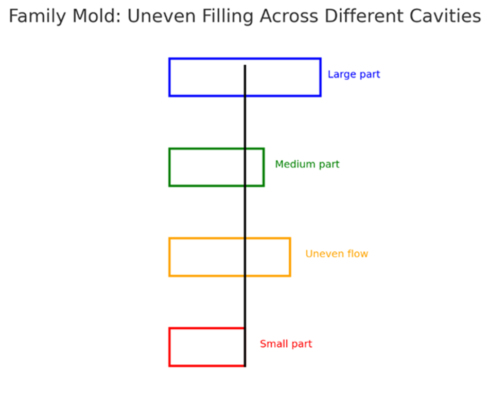 Diagram showing how different part sizes in one family mold create uneven filling/pressure, requiring more complex gating and sometimes hot runner systems.