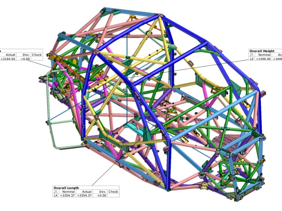 The following step involved a comprehensive inspection of the motorsport frame. By comparing the latest scan data with historical records, any structural changes or potential damage were identified. Importing the STL file representing the newly captured 3D mesh of the automotive frame into inspection software facilitated a side-by-side comparison with existing records. This critical analysis allowed for the detection of any deviations or changes in the frame's structure resulting from the stresses endured during the rally.