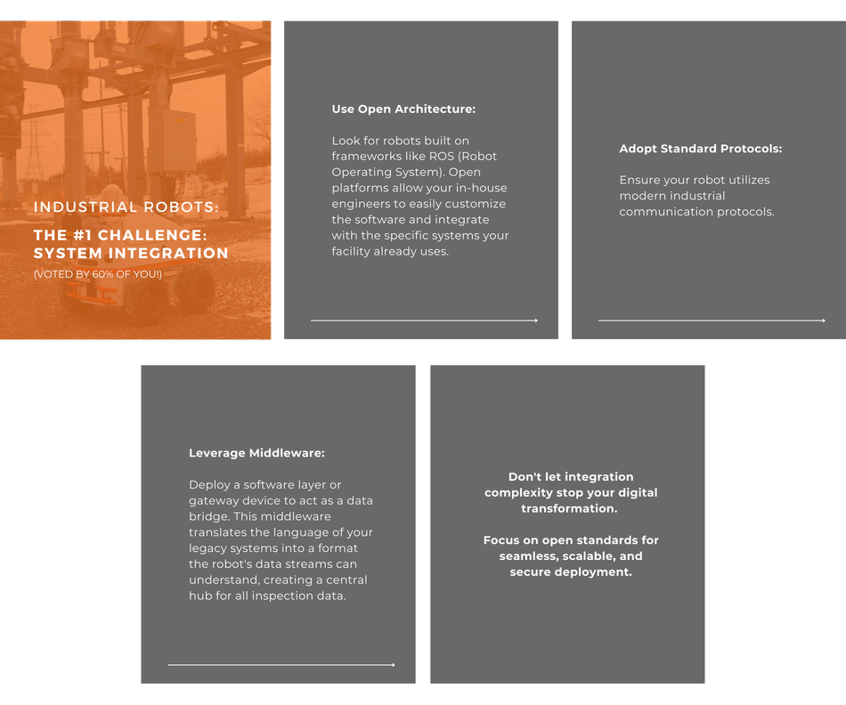 So we thought we’d take the pulse with a survey. Here’s the question we asked, via LinkedIn: “Which of the following challenges do you think is the biggest barrier preventing companies from adopting industrial inspection robots?” Here were the choices: