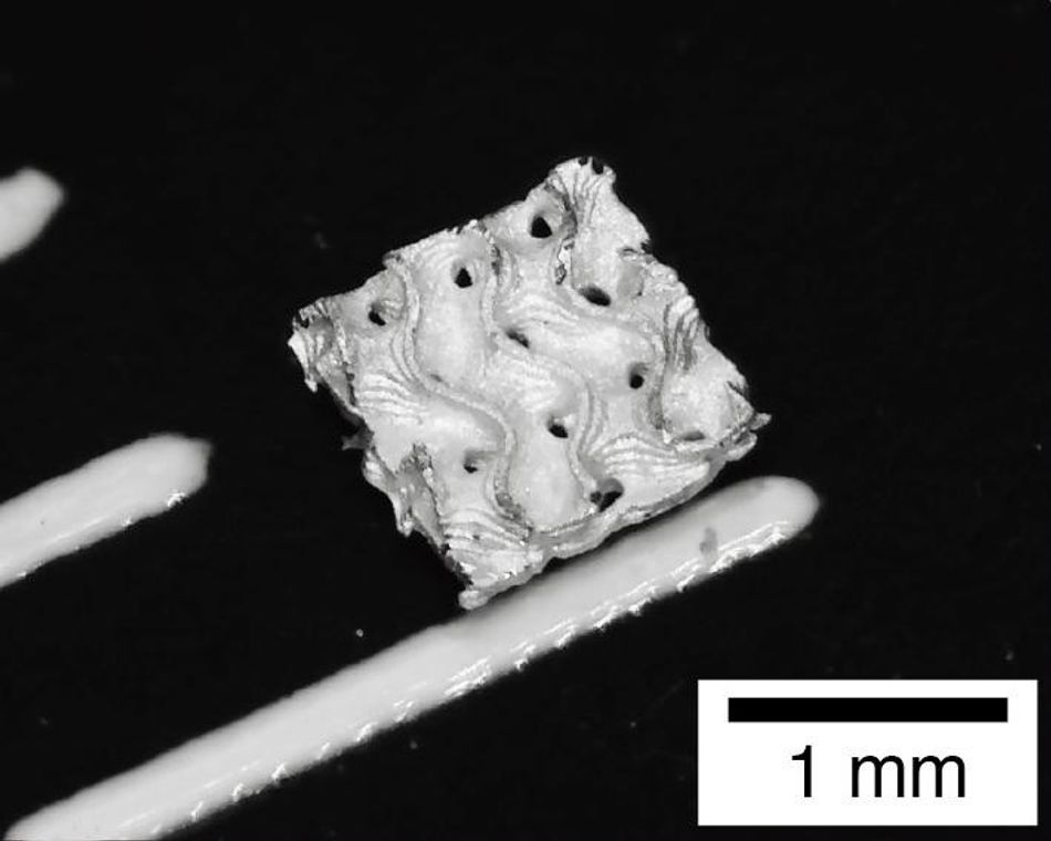 Small silver gyroid (markings are 1mm apart). ALCHEMY EPFL CC BY SA