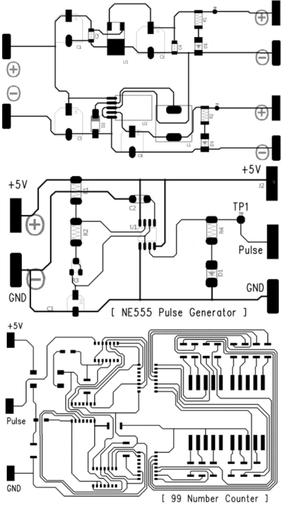 This board uses a 555 timer IC (NE555) to generate adjustable pulse signals that drive the decimal counter board. It includes the following components: