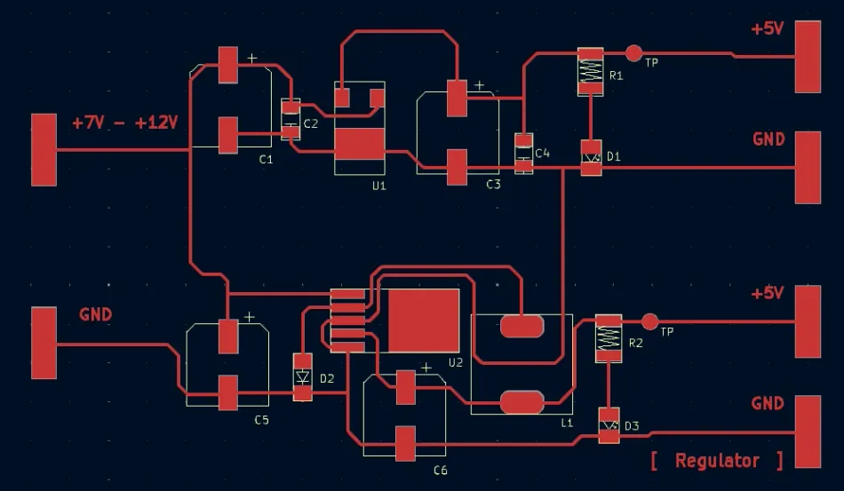 Voltage regulators maintain a stable output voltage regardless of fluctuations in input voltage or load conditions. They play a critical role in circuit stability by preventing voltage spikes or drops that could damage components. In this circuit, we included two different types of regulators for ease of comparison.