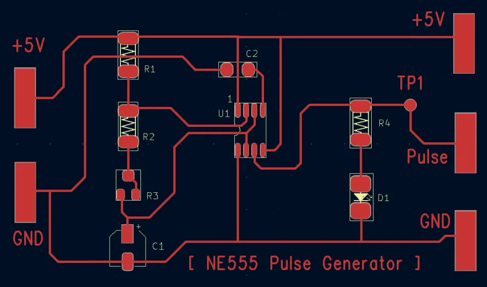The NE555 timer (U1) is a versatile and widely-used integrated circuit (IC) that can generate stable time delays or oscillations, depending on the external components configured around it. On this board, it operates in astable mode to generate continuous pulse signals.