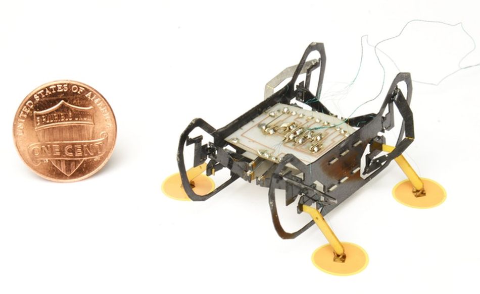 Researchers at Harvard University’s Wyss Institute for Biologically Inspired Engineering and John A. Paulson School of Engineering and Applied Sciences (SEAS) have created a micro-robot whose electroadhesive foot pads, origami ankle joints, and specially engineered walking gait allow it to climb on vertical and upside-down conductive surfaces, like the inside walls of a commercial jet engine. The work is reported in Science Robotics.