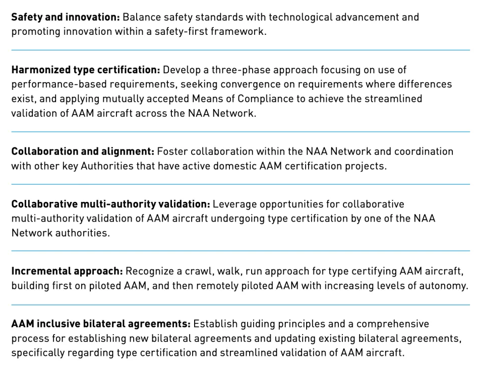 The roadmap’s Executive Summary explains the document “sets forth a unified and strategic approach to foster collaboration, safety assurance, technological innovation, and AAM inclusive bilateral agreements. In the face of emerging AAM technologies, including electric Vertical Take-Off and Landing (eVTOL) aircraft, the Roadmap outlines a clear path to align aircraft type certification standards, harmonize airworthiness requirements, and facilitate information sharing among network members to maximize the transferability of type certified AAM across the Network, whilst acknowledging an incremental approach to the type certification of AAM aircraft.”