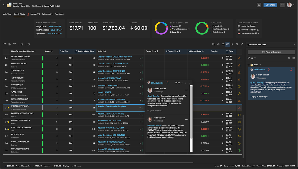 A mechanical partner can open the enclosure and PCB designs together, leave comments tied directly to the geometry, and track how changes evolve. A contract PCB designer can co-author the layout with the internal team instead of waiting for a scheduled handoff. Procurement partners can evaluate BOM changes as they happen, rather than react in haste to outdated spreadsheets. A manufacturer can surface DFM risks in the same environment where engineers make decisions — days or even weeks earlier than they’re used to.