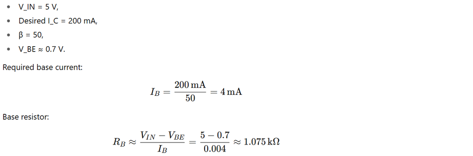 Compute Base Resistor. Use RB ≈ (VIN – VBE) / (Ic/β): Include a margin by driving the base with twice the minimum required current to guarantee saturation. For microcontrollers with limited output current (e.g. 20 mA per pin) use an intermediate driver transistor or MOSFET.